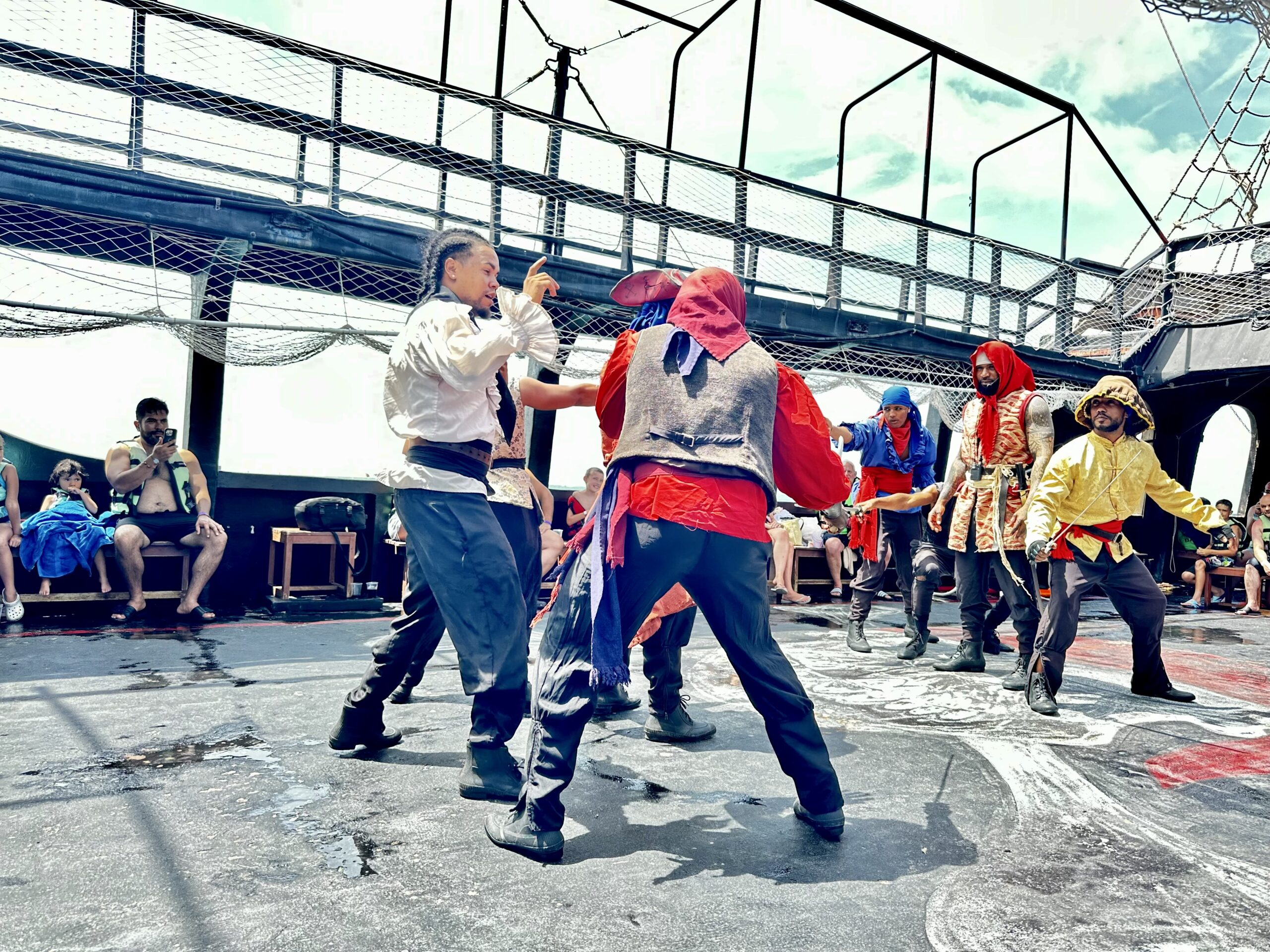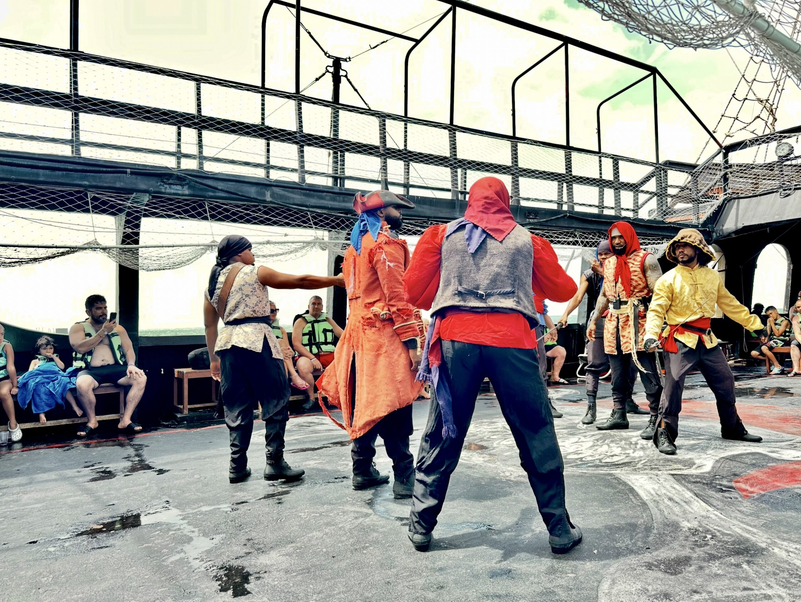 Navegue no majestoso e autêntico galeão La Hispaniola, onde cada momento é repleto de ação, diversão e pura adrenalina. Desde o embarque, você será transportado para um mundo de mistério e fantasia, com piratas rebeldes, tesouros escondidos e desafios inesperados. Aqui, você não é apenas espectador… você faz parte do show! Com a brisa do mar acariciando o rosto e o sol caribenho iluminando o azul cristalino do oceano, você receberá um treinamento pirata digno de lenda, aprendendo a enfrentar perigos e desvendar segredos no mapa do tesouro. Mergulhe nas águas quentes de Punta Cana para fazer snorkel e descubra um mundo submarino cheio de vida: recifes de corais vibrantes, peixes coloridos e majestosas arraias deslizando suavemente ao seu lado. Explore a misteriosa ilha dos tubarões e sinta a emoção de nadar ao lado dessas impressionantes criaturas em um ambiente totalmente seguro. Mas atenção! Piratas rebeldes podem atacar a qualquer momento com surpresas, jogos e desafios que vão arrancar risadas e gritos de emoção. Enquanto a diversão continua, aproveite o open bar com bebidas refrescantes e um delicioso lanche a bordo para recarregar as energias antes de voltar à ação. Suba a bordo e viva a magia dos mares neste espetáculo inesquecível!