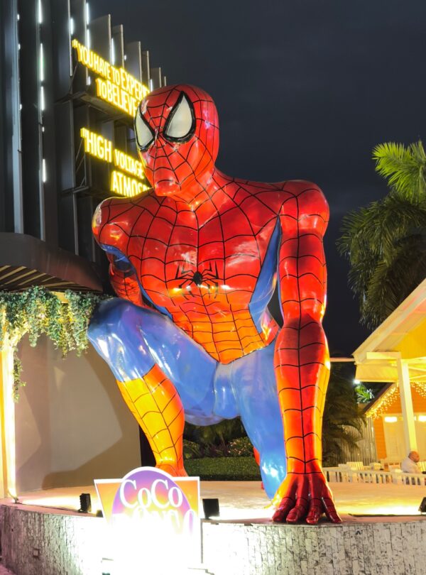 - Homem Aranha – O herói luta contra vilões em acrobacias aéreas impressionantes sobre a plateia.