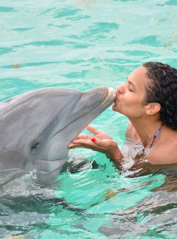 Nado com 1 Golfinho: Se você sonha em nadar com golfinhos e viver um pouco de adrenalina, no nado e interação com 1 Golfinho é a escolha certa. Aqui, você tem a oportunidade não só de interagir com os golfinhos, mas também de experimentar atividades exclusivas como o Belly Ride (quando o golfinho te leva deslizando pela água de barriga para cima) e o Boogie Push (um empurrão superdivertido em uma prancha). Entre uma atividade e outra, há momentos de carinho, beijos, acrobacias e muita interação. É uma experiência equilibrada que mistura emoção e ternura, perfeita para adultos e jovens que querem mais do que apenas observar.